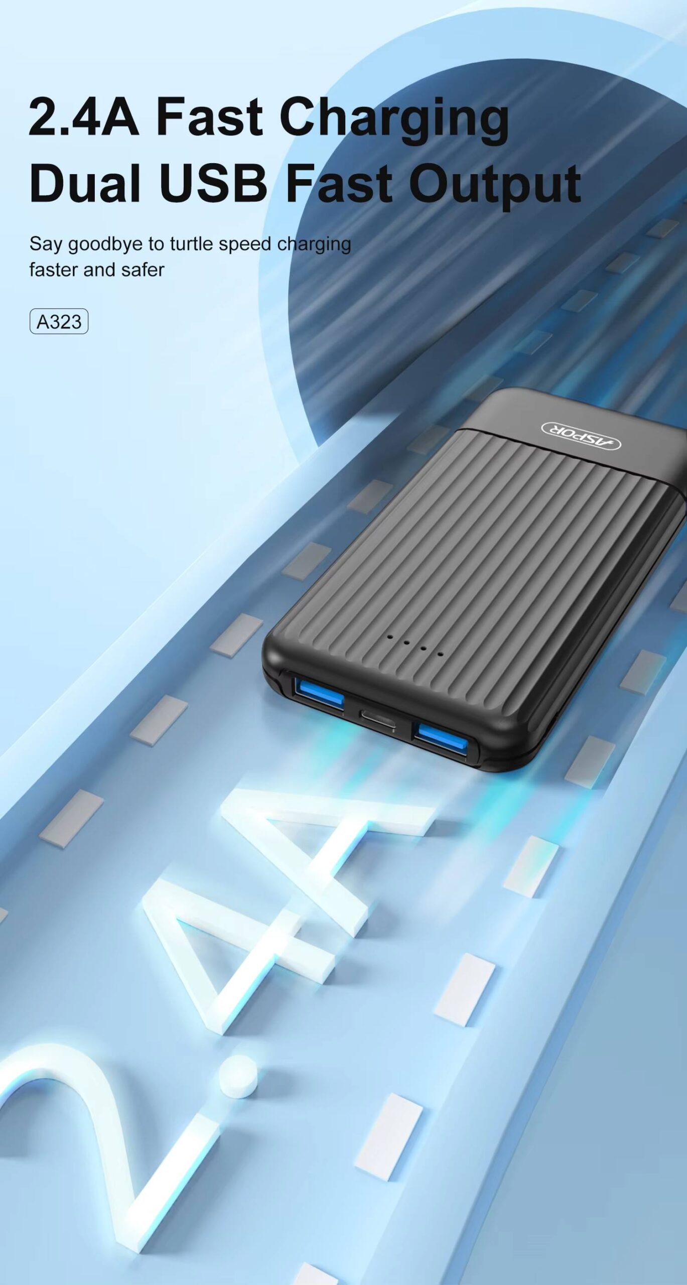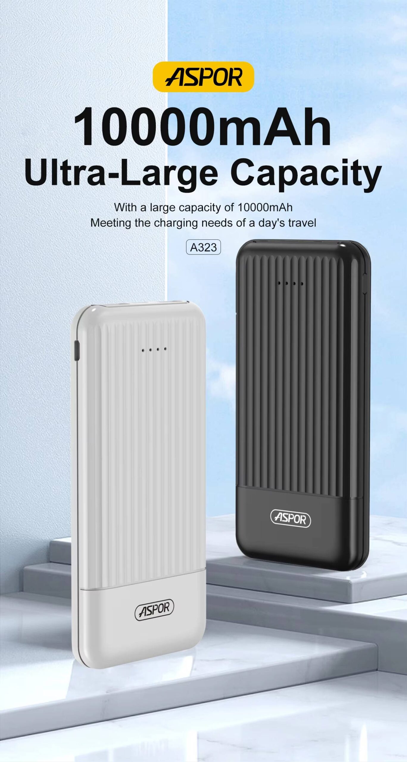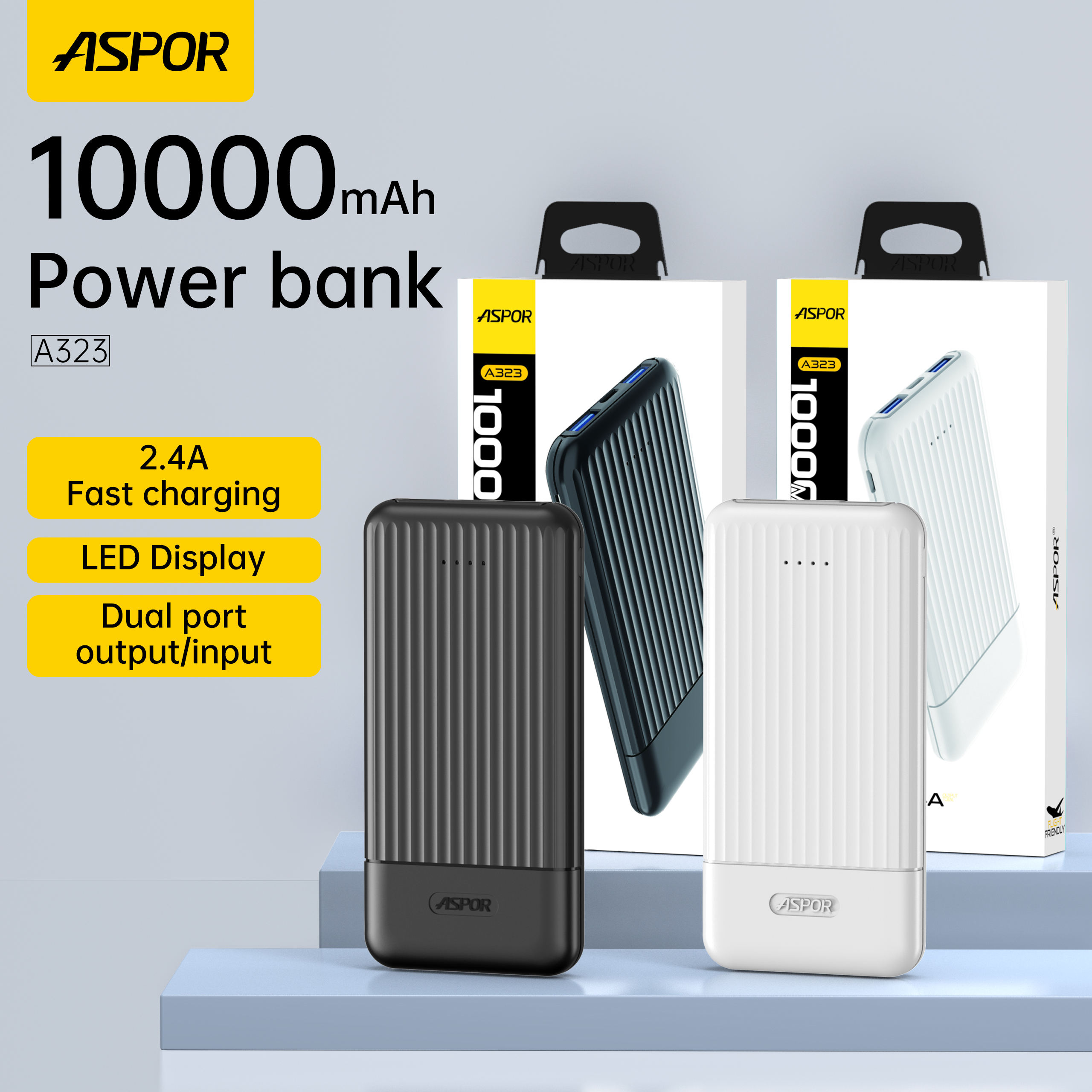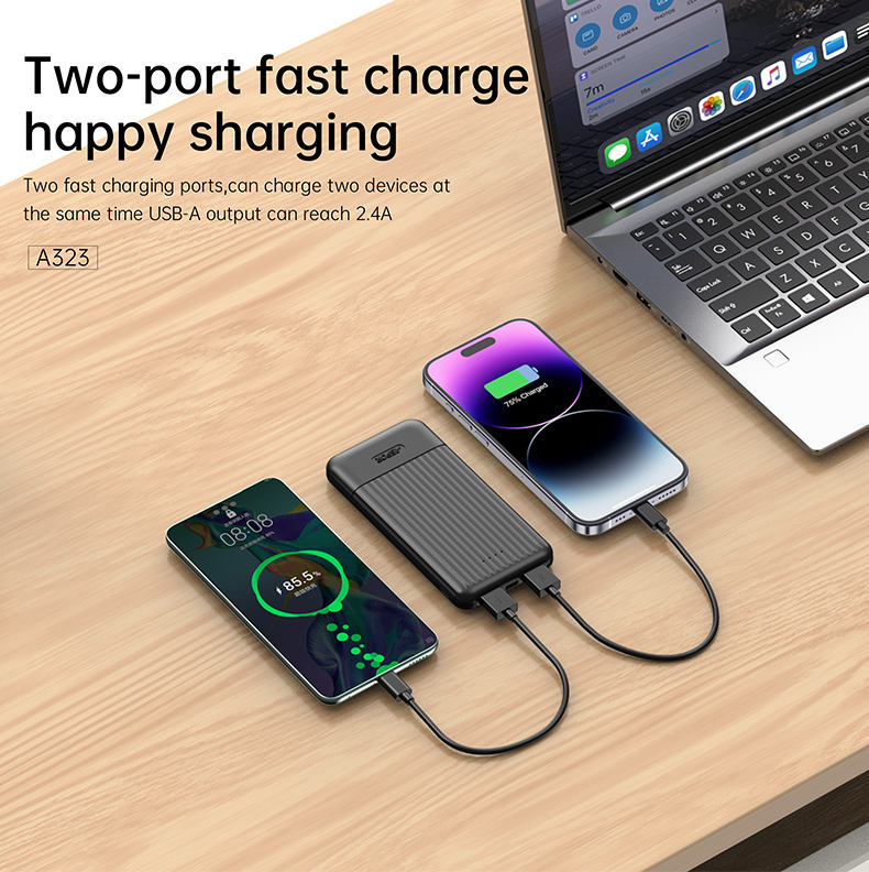 Aspor A323 Power Bank 10000mAh — compact, lightweight, and fast-charging with dual smart USB outputs (up to 2.4A each). Charge two devices simultaneously with built-in safety protection for safe and reliable power on the go.