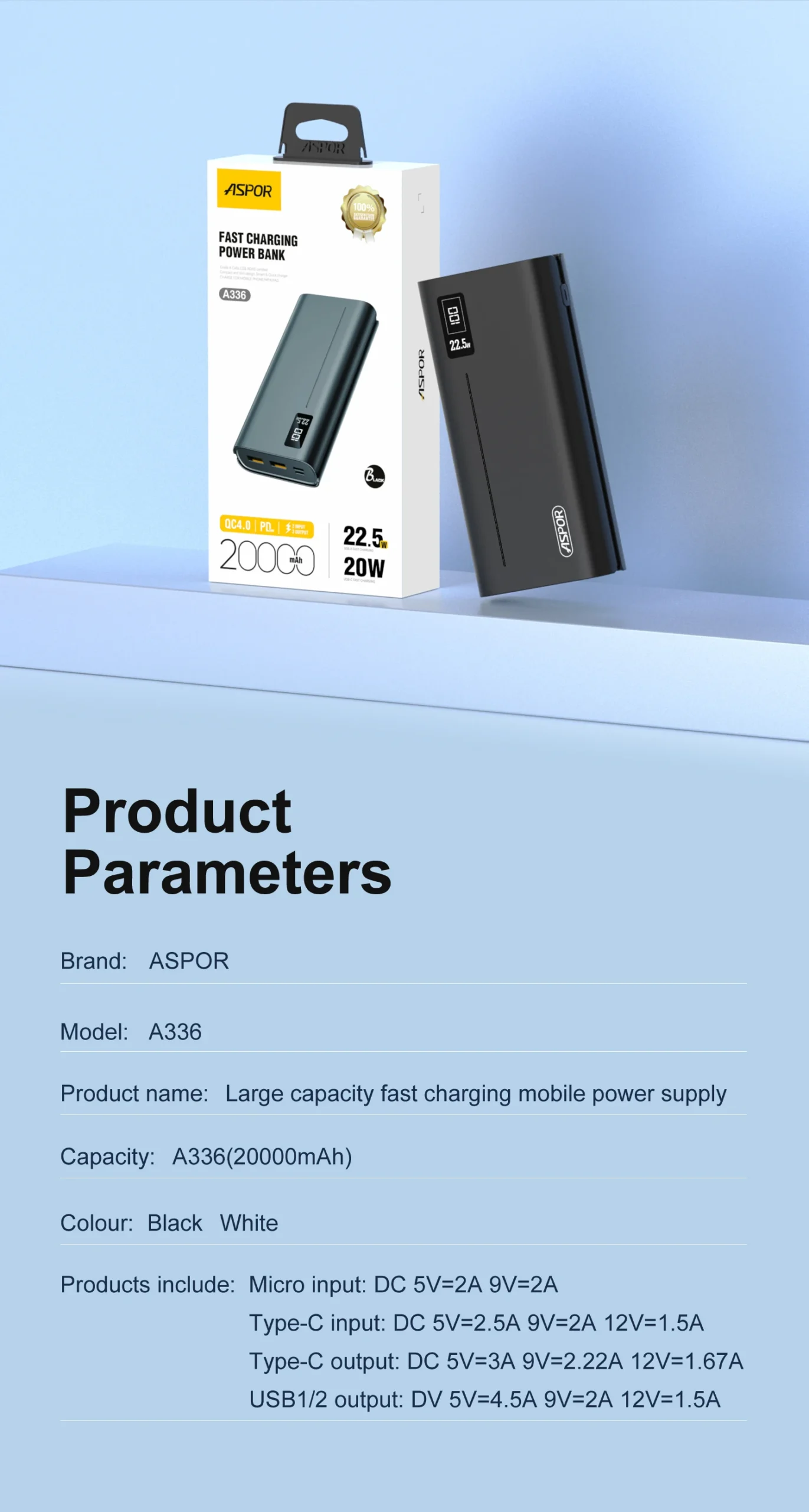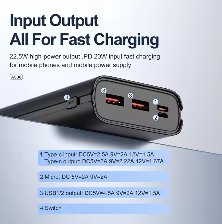 With a massive 20000mAh capacity (rated capacity 12000mAh), the Aspor A336 delivers multiple full charges, making it perfect for travel, work, outdoor activities, and emergencies.